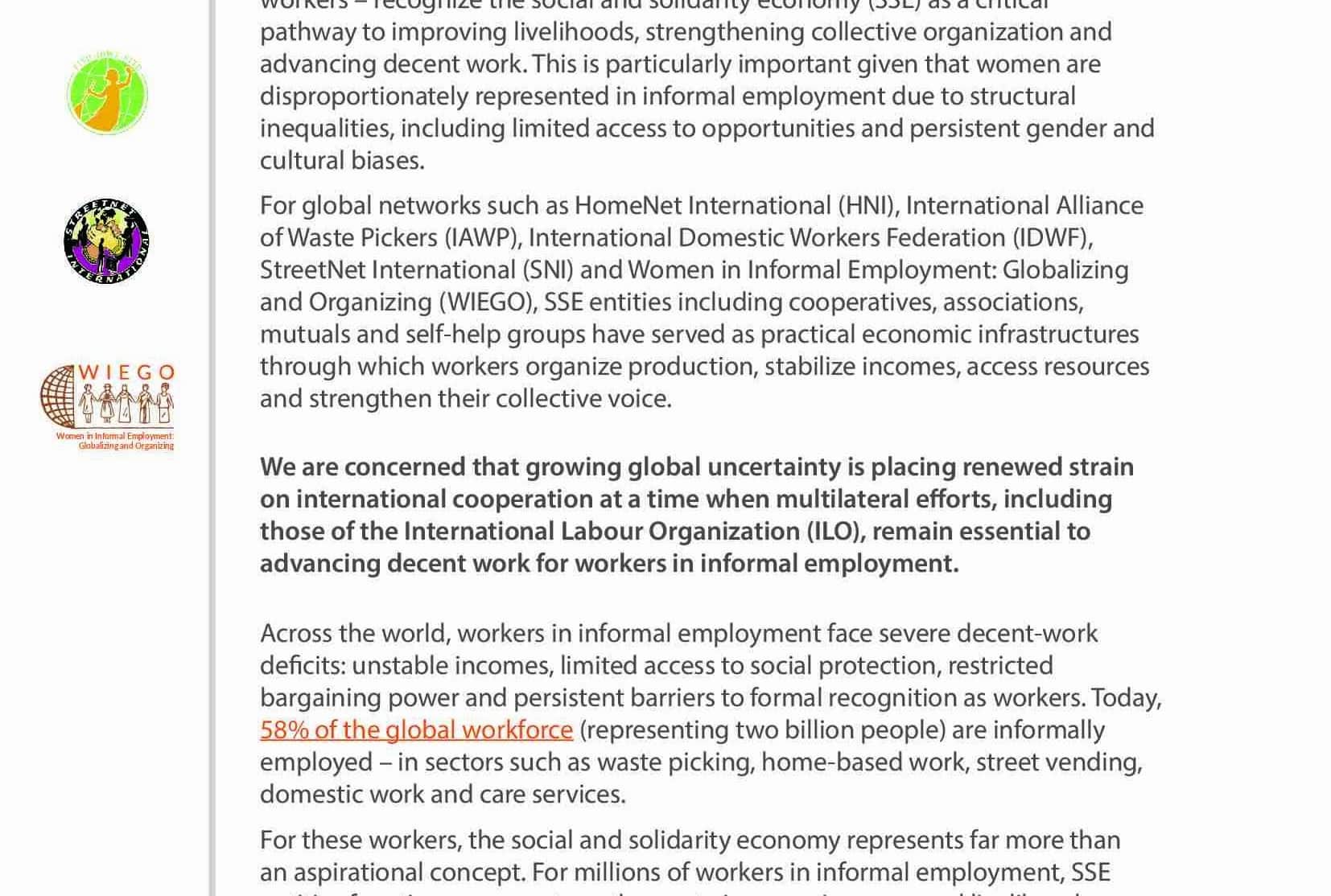 Organizations representing workers in informal employment – waste pickers, home‑based workers, street vendors and domestic workers, including migrant workers – recognize the social and solidarity economy (SSE) as a critical pathway to improving livelihoods, strengthening collective organization and advancing decent work. This is particularly important given that women are disproportionately represented in informal employment due to structural inequalities, including limited access to opportunities and persistent gender and cultural biases.