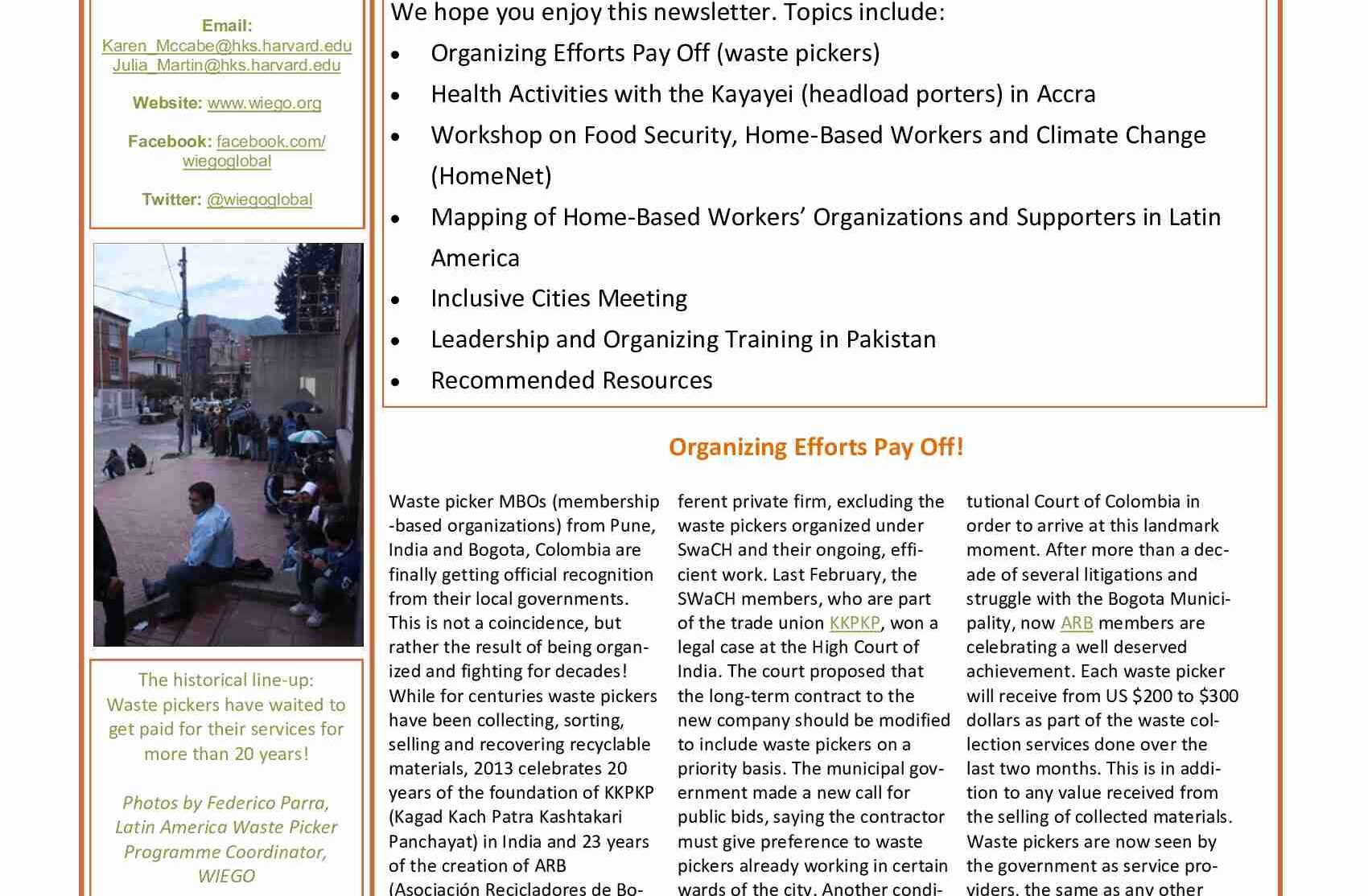 WIEGO's April 2013 Newsletter for Membership-Based Organizations of Informal Workers