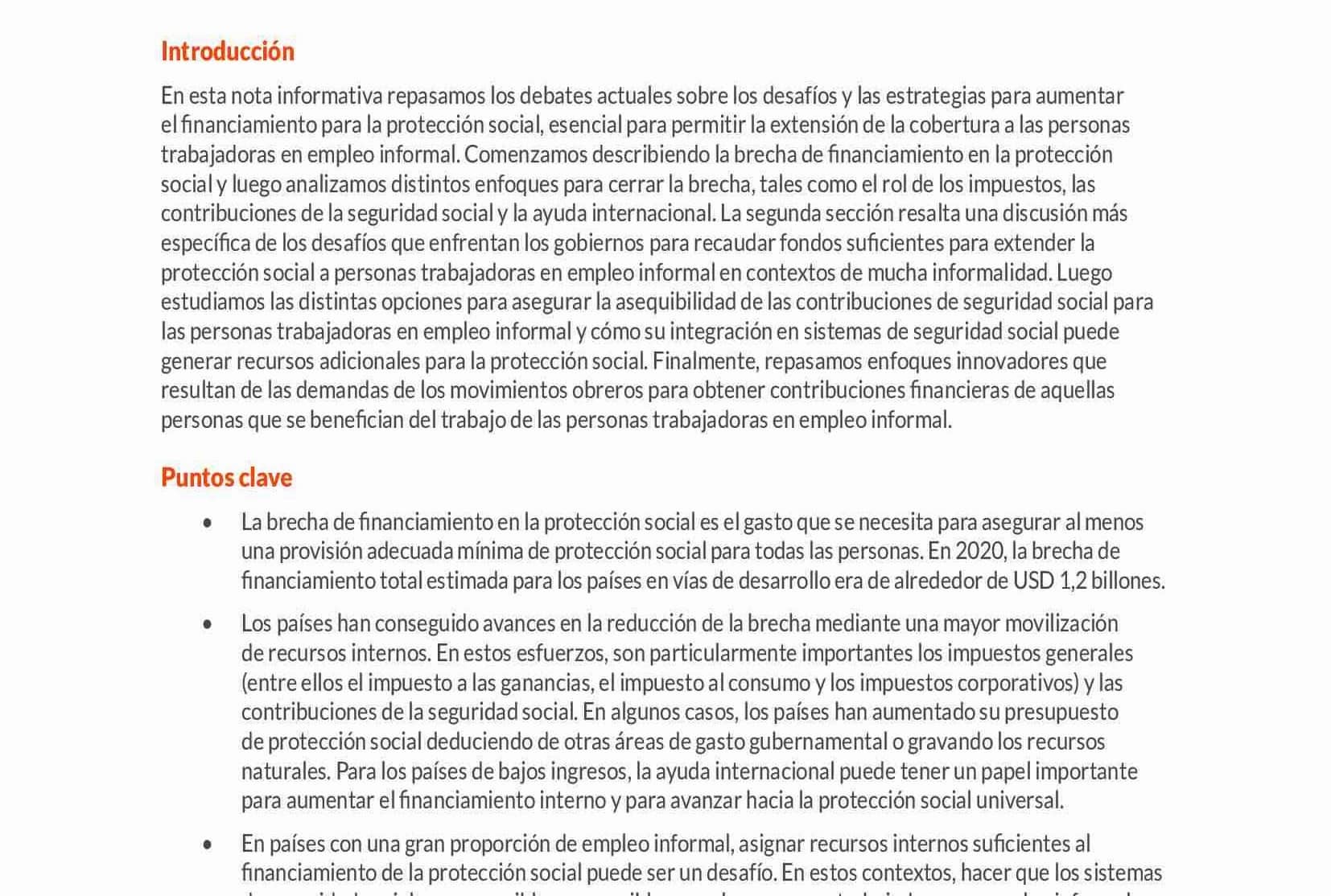 En esta nota informativa, revisamos los debates actuales acerca de los desafíos y estrategias para aumentar la financiación de la protección social, la cual es esencial para permitir la extensión de cobertura a las personas trabajadoras en empleo informal. Comenzamos describiendo la brecha financiera de la protección social, para luego examinar diferentes enfoques destinados a cerrar dicha brecha, incluyendo el papel de la tributación, las contribuciones a la seguridad social y la ayuda internacional. La segunda sección destaca una discusión más específica de los desafíos que enfrentan los gobiernos al intentar recaudar financiamiento suficiente para expandir la protección social a las personas trabajadoras en empleo informal en contextos de alta informalidad. A continuación, exploramos distintas opciones para garantizar la asequibilidad de las contribuciones al seguro social para las personas trabajadoras en empleo informal y cómo su integración en los sistemas de seguro social puede generar recursos adicionales para la protección social. Finalmente, discutimos enfoques innovadores que surgen de las demandas de los movimientos de trabajadores para obtener contribuciones financieras de aquellos que se benefician del trabajo de las personas trabajadoras en empleo informal.
