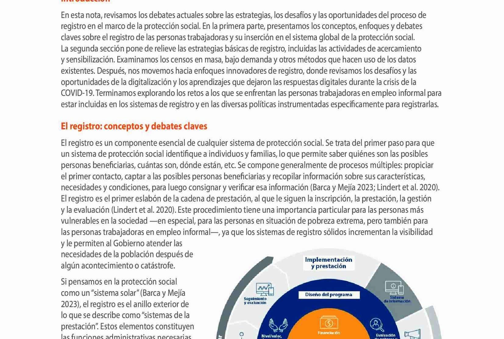 En esta nota informativa repasamos los debates actuales sobre estrategias, retos y oportunidades en relación con el registro en el contexto de la protección social. En la primera parte, presentaremos los conceptos, enfoques y debates clave sobre el registro y lo situaremos en el sistema general de protección social. En la segunda sección se destacan las estrategias básicas de registro, incluidas la divulgación y la sensibilización. Examinamos los métodos a la carta, los barridos censales y otros métodos que utilizan los datos existentes. A continuación, pasamos a los enfoques innovadores del registro, donde examinamos los retos y las oportunidades de la digitalización y lo que podemos aprender de las respuestas habilitadas digitalmente a la crisis de COVID-19. Concluimos explorando los retos a los que se enfrentan lxs trabajadorxs en empleo informal para ser incluidxs en los sistemas de registro y las diferentes políticas aplicadas para registrar específicamente a estxs trabajadorxs.