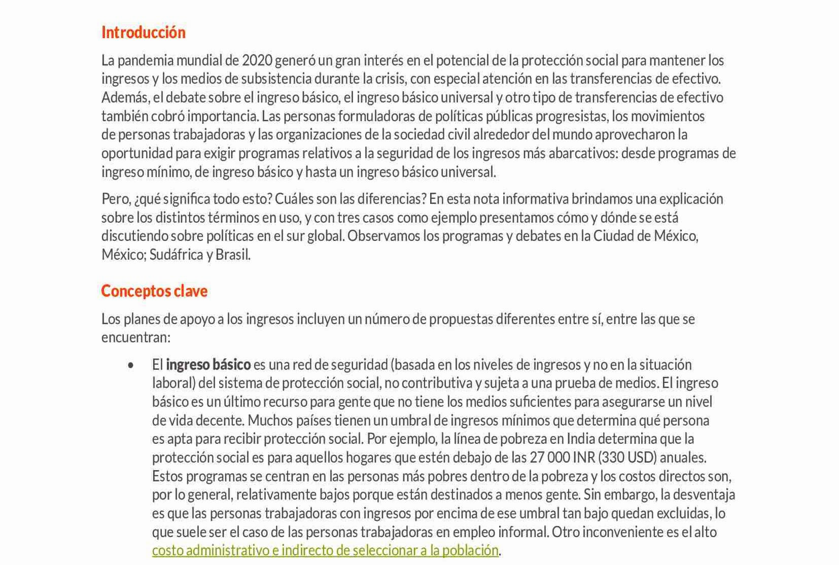 La pandemia mundial de 2020 generó un gran interés en el potencial de la protección social para apoyar los ingresos y los medios de subsistencia durante la crisis, con especial atención en las transferencias de efectivo. Por otro lado, el debate sobre el ingreso básico, el ingreso básico universal y otro tipo de transferencias de efectivo también cobró importancia. Las personas formuladoras de políticas públicas progresistas, los movimientos de personas trabajadoras y las organizaciones de la sociedad civil alrededor del mundo aprovecharon la oportunidad para exigir programas relativos a la seguridad de los ingresos más abarcativos: desde programas de ingreso mínimo, de ingreso básico y hasta un ingreso básico universal. Pero, ¿qué significa todo esto realmente? ¿Cuáles son las diferencias? En esta nota informativa explicamos los distintos términos en uso y presentamos tres casos para repasar cómo y dónde se están discutiendo políticas en el sur global.