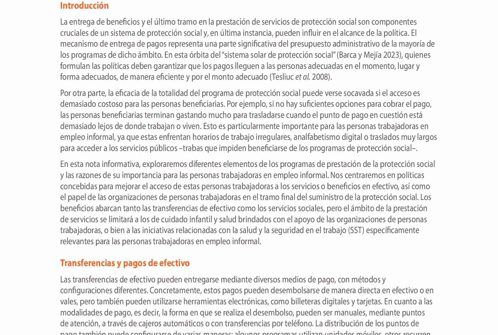 En esta nota informativa, exploraremos diferentes elementos de los programas de prestación de la protección social y las razones de su importancia para las personas trabajadoras en empleo informal. Nos centraremos en políticas concebidas para mejorar el acceso de estas personas trabajadoras a los servicios o beneficios en efectivo, así como el papel de las organizaciones de personas trabajadoras en el tramo final del suministro de la protección social. Los beneficios abarcan tanto las transferencias de efectivo como los servicios sociales, pero el ámbito de la prestación de servicios se limitará a los de cuidado infantil y salud brindados con el apoyo de las organizaciones de personas trabajadoras, o bien a las iniciativas relacionadas con la salud y la seguridad en el trabajo (SST) específicamente relevantes para las personas trabajadoras en empleo informal.