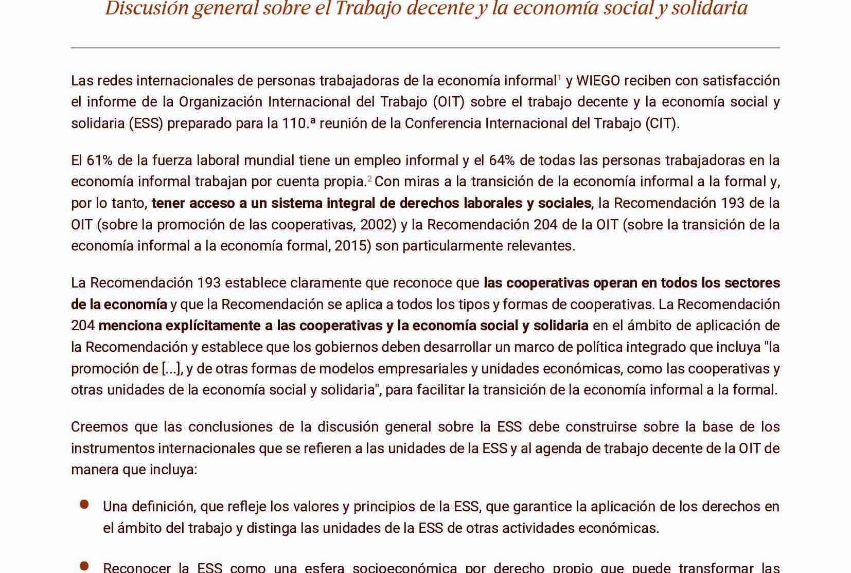 Documento de Posición Global sobre el trabajo decente y la economía social y solidaria, preparado en el marco del 110° período de sesiones de la Conferencia Internacional del Trabajo (versión resumida)