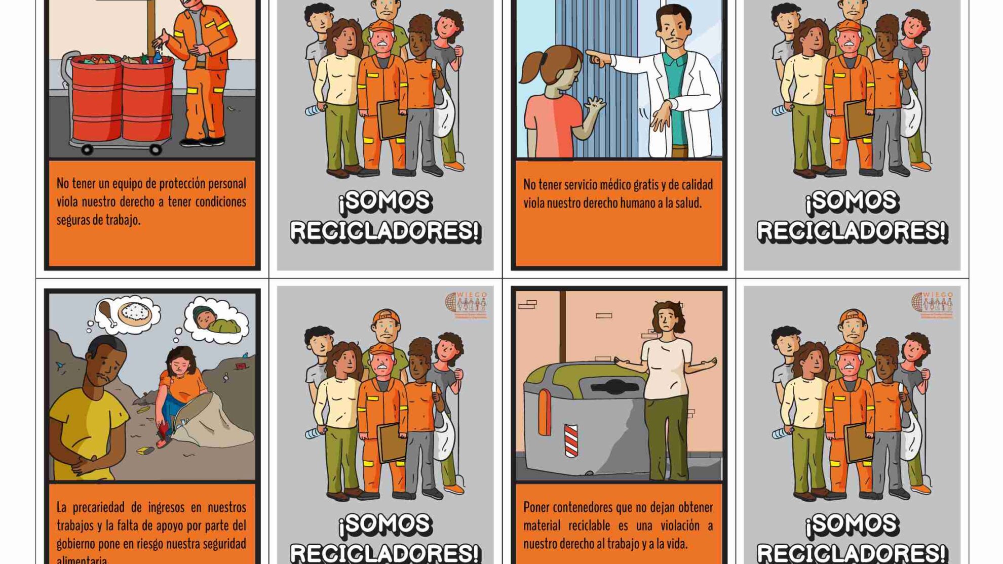 Este memorama educativo invita a las personas recicladoras a reflexionar sobre sus derechos humanos y laborales mientras juegan. Cada tarjeta muestra imágenes y mensajes que ilustran realidades como la falta de reconocimiento, la exclusión de la seguridad social, la violencia y los desalojos, así como la importancia de la organización colectiva y la defensa del trabajo digno. Ideal para talleres, procesos de formación y educación popular, el juego combina diversión con aprendizaje para fortalecer la conciencia de derechos y el empoderamiento legal de quienes trabajan en el reciclaje informal.