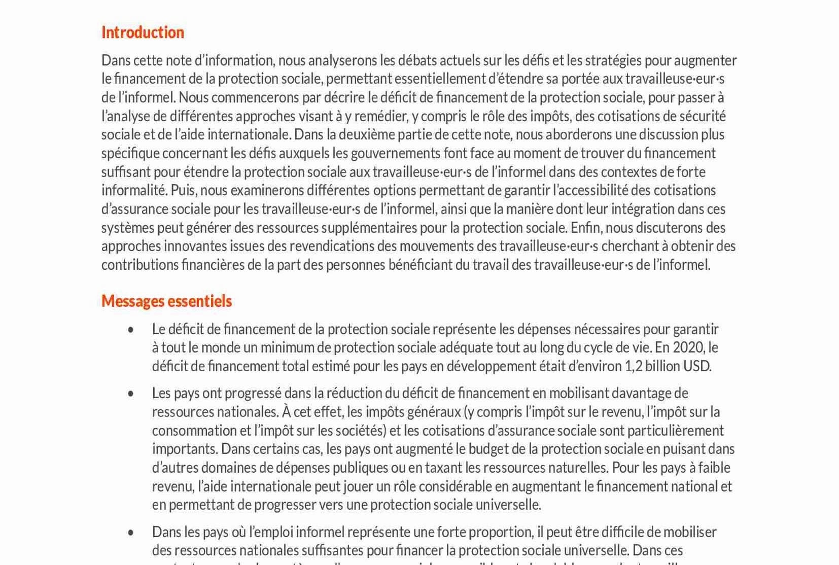 Dans cette note d’information, nous analyserons les débats actuels sur les défis et les stratégies pour augmenter le financement de la protection sociale, permettant essentiellement d’étendre sa portée aux travailleuse·eur·s de l’informel. Nous commencerons par décrire le déficit de financement de la protection sociale, pour passer à l’analyse de différentes approches visant à y remédier, y compris le rôle des impôts, des cotisations de sécurité sociale et de l’aide internationale. Dans la deuxième partie de cette note, nous aborderons une discussion plus spécifique concernant les défis auxquels les gouvernements font face au moment de trouver du financement suffisant pour étendre la protection sociale aux travailleuse·eur·s de l’informel dans des contextes de forte informalité. Puis, nous examinerons différentes options permettant de garantir l’accessibilité des cotisations d’assurance sociale pour les travailleuse·eur·s de l’informel, ainsi que la manière dont leur intégration dans ces systèmes peut générer des ressources supplémentaires pour la protection sociale. Enfin, nous discuterons des approches innovantes issues des revendications des mouvements des travailleuse·eur·s cherchant à obtenir des contributions financières de la part des personnes bénéficiant du travail des travailleuse·eur·s de l’informel.