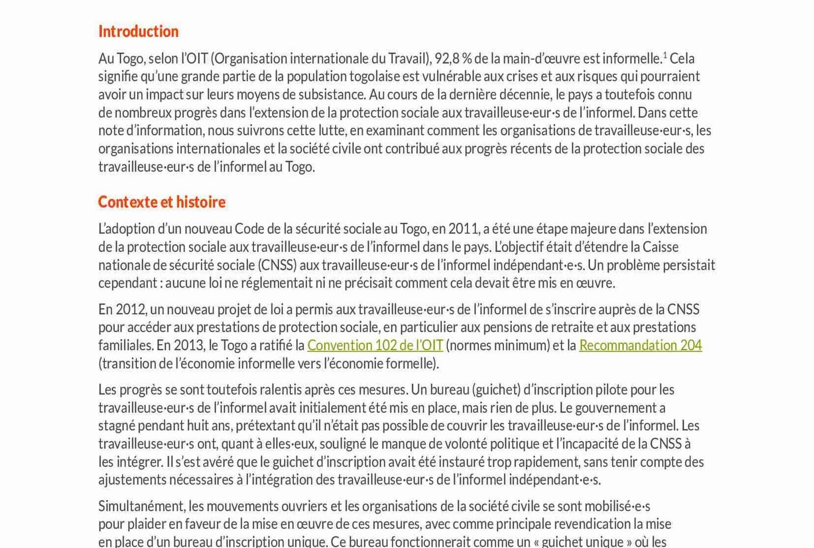 Au Togo, selon l’OIT (Organisation internationale du Travail), 92,8 % de la main-d’œuvre est informelle.1 Cela signi e qu’une grande partie de la population togolaise est vulnérable aux crises et aux risques qui pourraient avoir un impact sur leurs moyens de subsistance. Au cours de la dernière décennie, le pays a toutefois connu de nombreux progrès dans l’extension de la protection sociale aux travailleuse·eur·s de l’informel. Dans cette note d’information, nous suivrons cette lutte, en examinant comment les organisations de travailleuse·eur·s, les organisations internationales et la société civile ont contribué aux progrès récents de la protection sociale des travailleuse·eur·s de l’informel au Togo.