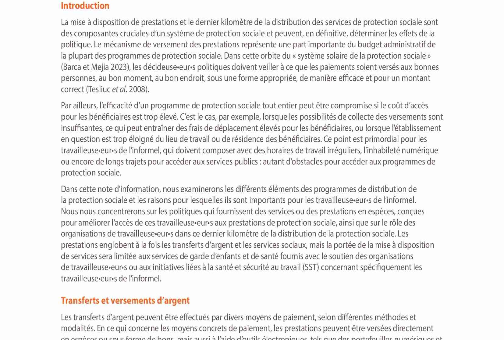 Dans cette note d’information, nous examinerons les différents éléments des programmes de distribution de la protection sociale et les raisons pour lesquelles ils sont importants pour les travailleuse•eur•s de l’informel. Nous nous concentrerons sur les politiques qui fournissent des services ou des prestations en espèces, conçues pour améliorer l’accès de ces travailleuse•eur•s aux prestations de protection sociale, ainsi que sur le rôle des organisations de travailleuse•eur•s dans ce dernier kilomètre de la distribution de la protection sociale. Les prestations englobent à la fois les transferts d’argent et les services sociaux, mais la portée de la mise à disposition de services sera limitée aux services de garde d’enfants et de santé fournis avec le soutien des organisations de travailleuse•eur•s ou aux initiatives liées à la santé et sécurité au travail (SST) concernant spécifiquement les travailleuse•eur•s de l’informel.