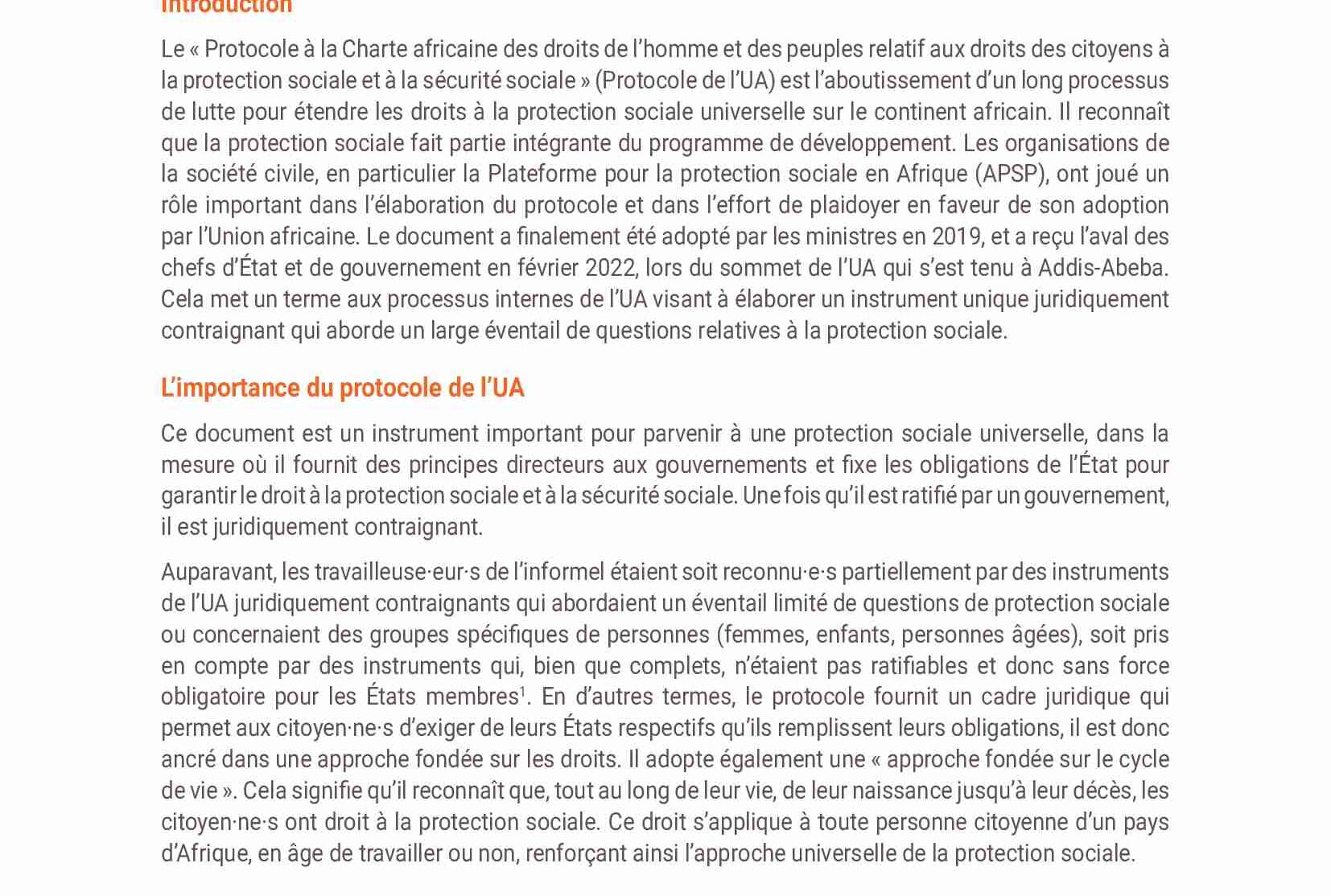 Le « Protocole à la Charte africaine des droits de l’homme et des peuples relatif aux droits des citoyens à la protection sociale et à la sécurité sociale » (Protocole de l’UA) est l’aboutissement d’un long processus de lutte pour étendre les droits à la protection sociale universelle sur le continent africain. Il reconnaît que la protection sociale fait partie intégrante du programme de développement.