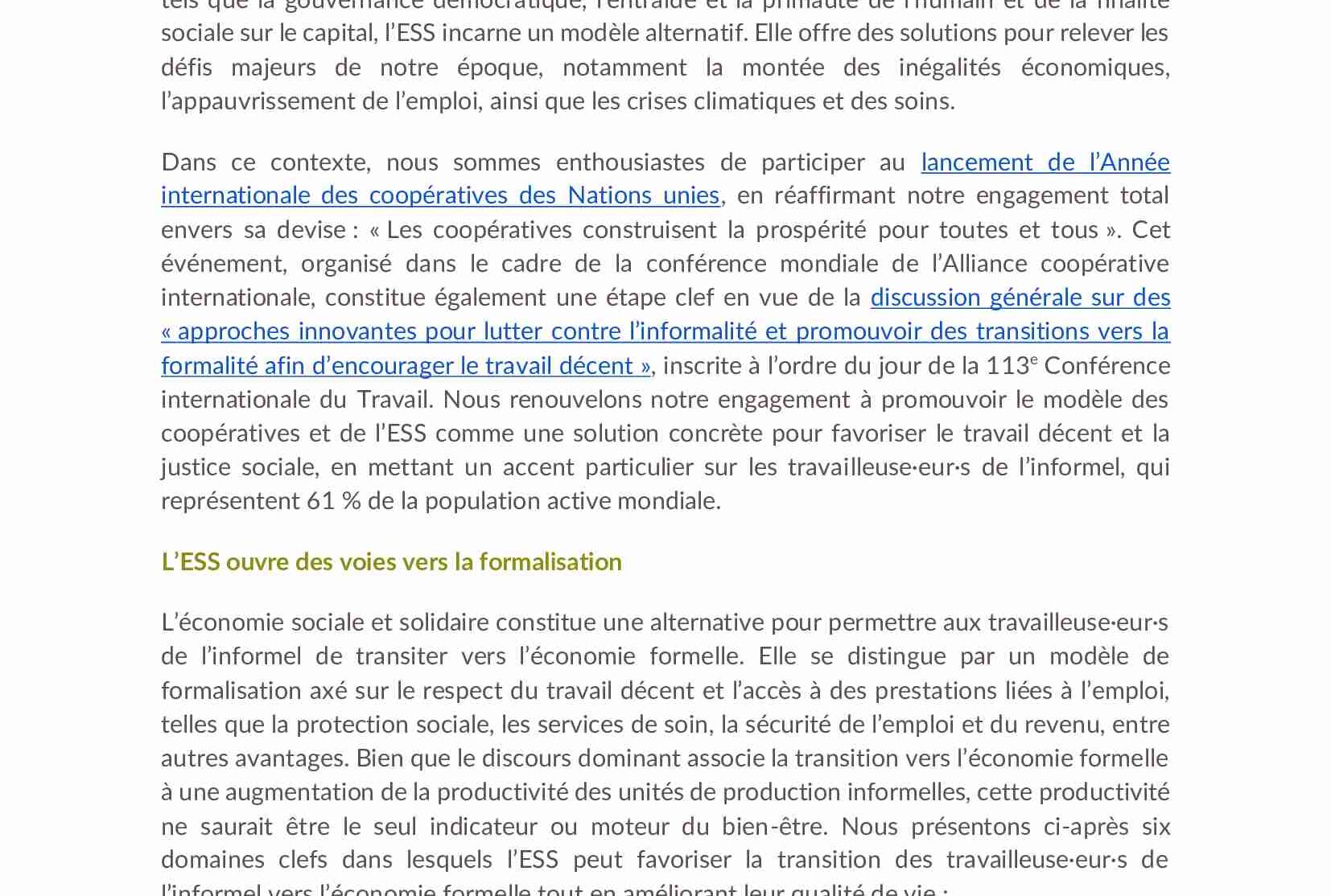Lors du lancement de l’Année internationale des coopératives des Nations Unies à la Conférence mondiale de l’ACI, la déclaration intitulée « Économie sociale et solidaire : Un appel au changement systémique » a été présentée. Ce document souligne le rôle essentiel des entités de l’Économie sociale et solidaire (ESS), telles que les coopératives et les associations, dans la résolution des grands défis mondiaux tels que l’inégalité économique, le travail précaire et les crises climatiques. Il met également en lumière le potentiel de l’ESS à favoriser les transitions de l’emploi informel vers l’emploi formel, en garantissant un travail décent et une justice sociale pour les 61 % de la population active mondiale engagée dans l’emploi informel. Cet événement a également servi de préparation à la Conférence internationale du travail de 2025, axée sur des approches innovantes pour les transitions de l’informalité à la formalité.