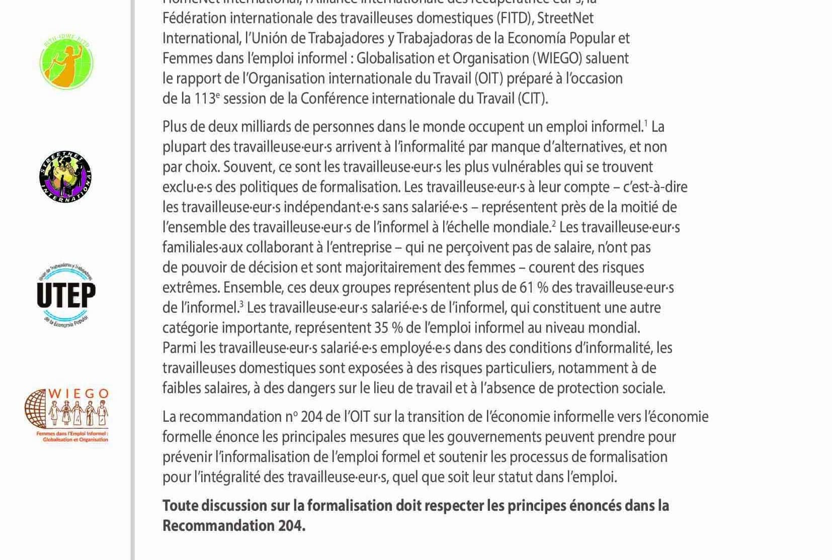 Cette prise de position a été préparée pour la 113e session de la Conférence internationale du Travail (CIT), lors de la discussion générale sur les approches novatrices pour lutter contre l'informalité et promouvoir les transitions vers la formalité afin de favoriser le travail décent.