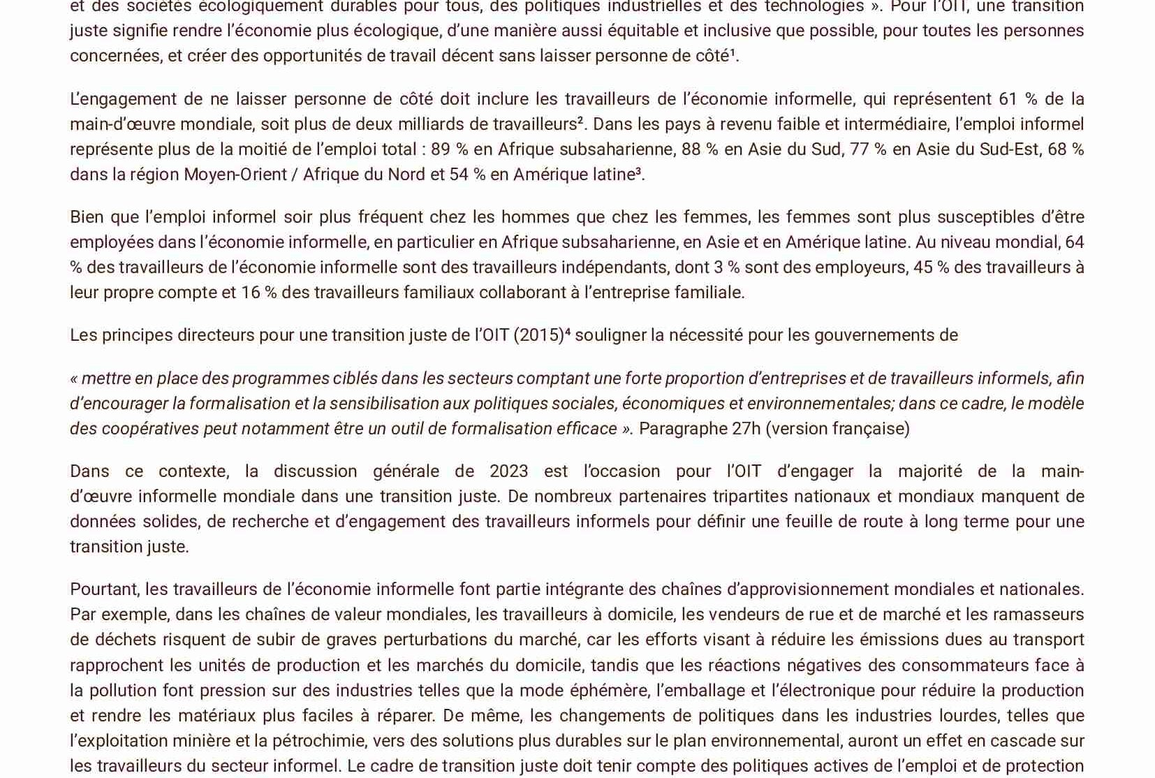 Une transition juste pour les travailleurs de l’économie informelle : Considérations sur la transition juste à prendre en compte lors de la discussion générale de la 111e session de la CIT