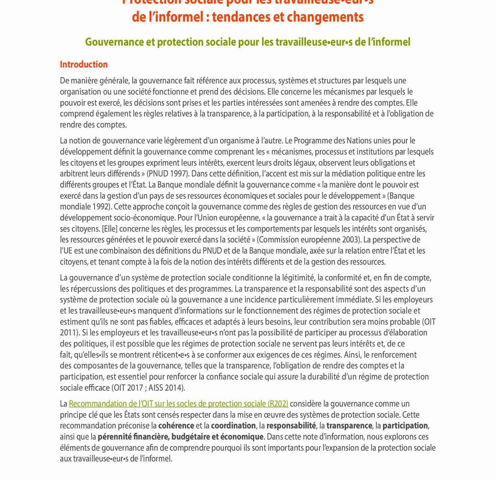 Notre cartographie comprend des synthèses accessibles, issues d’une analyse de la littérature mondiale, sur les différentes composantes de base des systèmes de protection sociale, à savoir le financement, l’enregistrement de travailleuse·eur·s, la gouvernance et la prestation des services. Ces résumés évaluent, d’un regard critique, les défis et les réalisations de chaque composante et sont disponibles en anglais, en français et en espagnol.