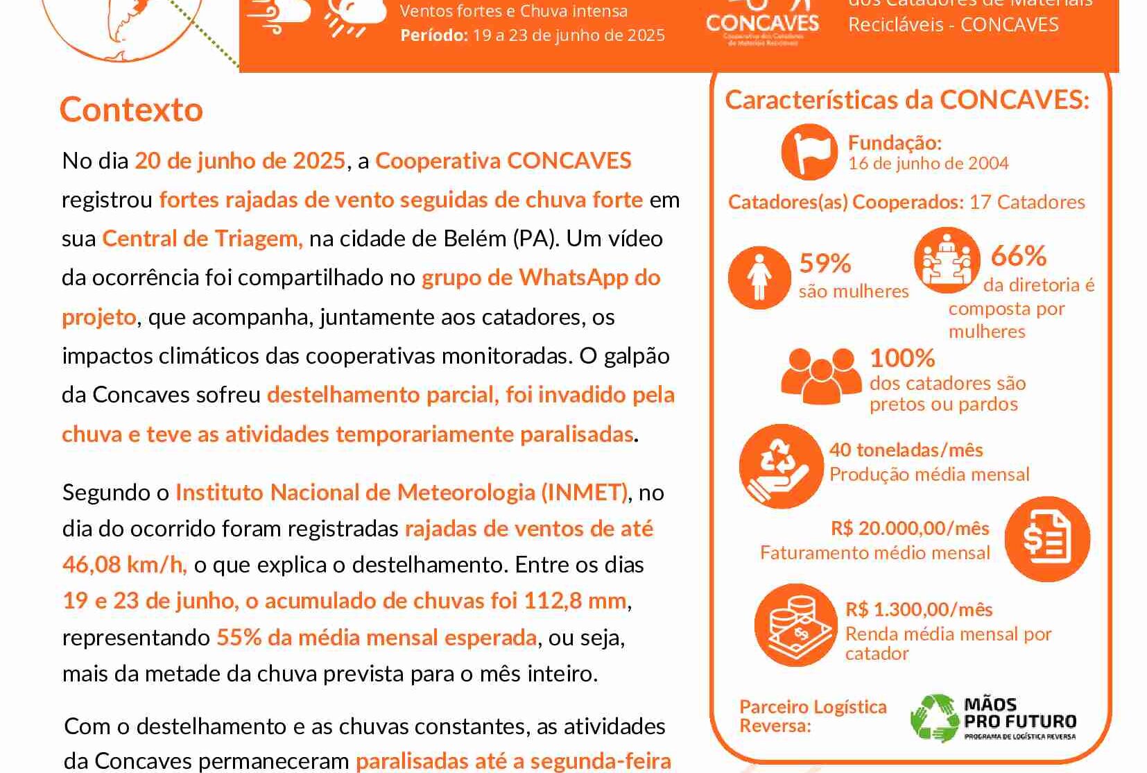 Nesta edição, o boletim traz o caso da cooperativa CONCAVES, localizada na cidade de Belém, na região norte do Brasil, que sofreu com a combinação de ventos fortes e chuvas constantes em junho de 2025. As rajadas de vento provocaram o destelhamento parcial do galpão, agravando os alagamentos internos e comprometendo a segurança e o funcionamento das atividades produtivas. As operações foram paralisadas por vários dias e houve prejuízos na comercialização dos materiais. O evento revelou a fragilidade estrutural da central de triagem e a dificuldade de preparação institucional para enfrentar emergências climáticas. A iniciativa faz parte do projeto de Monitoramento de Eventos Climáticos Extremos da WIEGO, com apoio do Programa Mãos Pro Futuro, que atua em seis capitais brasileiras.