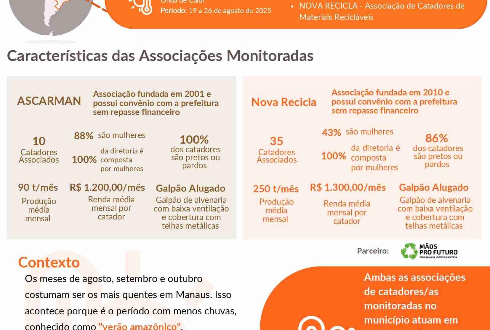 Nesta edição, o boletim destaca os efeitos da onda de calor que atingiu Manaus entre 19 e 26 de agosto de 2025, afetando diretamente as associações ASCARMAN e Nova Recicla. As temperaturas ultrapassaram 36 °C, com sensação térmica chegando a 40 °C, agravando as condições já inadequadas dos galpões, marcados por baixa ventilação e telhados metálicos. Entre os principais impactos observados estão o desconforto térmico, sintomas físicos relacionados ao calor, queda na produtividade, aumento de ausências e necessidade de reduzir a jornada de trabalho. O boletim evidencia como eventos de calor extremo comprometem saúde, renda e continuidade das atividades, ressaltando a urgência de medidas de adaptação climática e melhorias estruturais para proteger os catadores.
