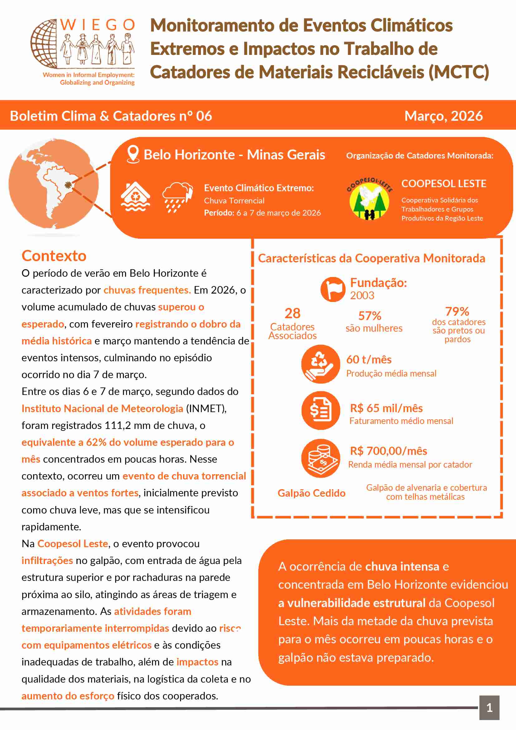 Nesta edição, o boletim destaca os impactos de um evento de chuva torrencial que atingiu Belo Horizonte entre os dias 6 e 7 de março de 2026, afetando diretamente a cooperativa Coopesol Leste. Segundo o INMET, foram registrados 111,2 mm de chuva em poucas horas, o equivalente a 62% do volume esperado para o mês, associados a ventos fortes e à possível ocorrência de microexplosão. O evento evidenciou fragilidades estruturais críticas no galpão, como infiltrações, alagamentos internos e riscos envolvendo equipamentos elétricos, levando à interrupção temporária das atividades, redução da produtividade e comprometimento da qualidade dos materiais recicláveis, especialmente papel e papelão, com perdas de valor e renda. O boletim também aponta a ausência de medidas estruturadas de adaptação, com respostas predominantemente reativas, reforçando a urgência de melhorias estruturais e estratégias de adaptação climática para proteger os catadores.