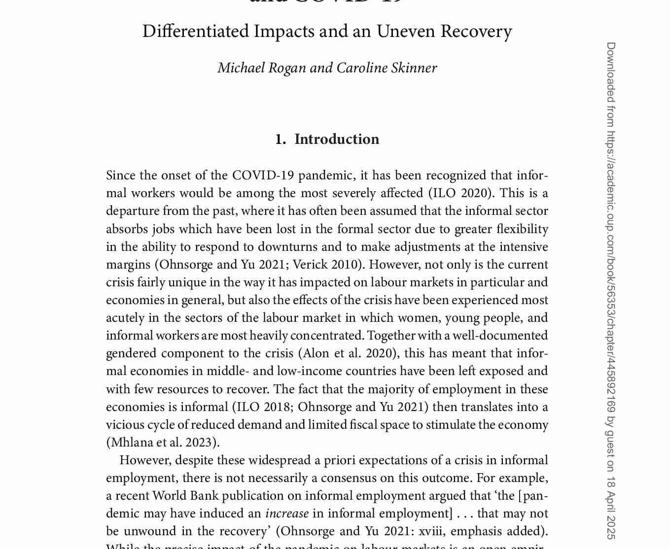 This chapter seeks to identify the differentiated impacts of the COVID-19 crisis on specific groups of informal workers. The analysis draws on official, nationally representative labour force surveys collected quarterly by Statistics South Africa. The chapter aims to identify the labour market impacts of the first three waves of the COVID-19 pandemic and of one of the world’s strictest lockdowns. The research focuses on the different impacts by gender, sector, and status in employment. The findings show that job losses have been greater in the informal economy. The data suggest uneven impacts within the informal economy, with women being particularly hard hit. The pandemic period has thus widened pre-existing inequalities and fault lines. In policy terms, this suggests that the informal economy should be a priority in economic recovery efforts but also that support requires differentiated approaches and a range of measures.