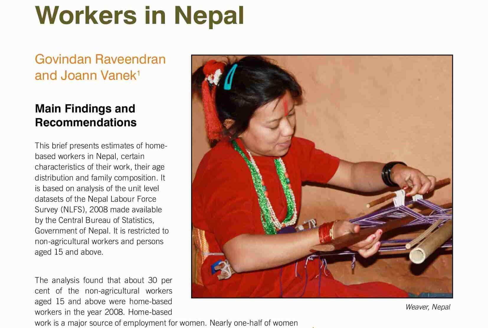 This brief presents estimates of home-based workers in Nepal, certain characteristics of their work, their age distribution and family composition. It is based on analysis of the unit level datasets of the Nepal Labour Force Survey (NLFS), 2008 made available by the Central Bureau of Statistics, Government of Nepal.